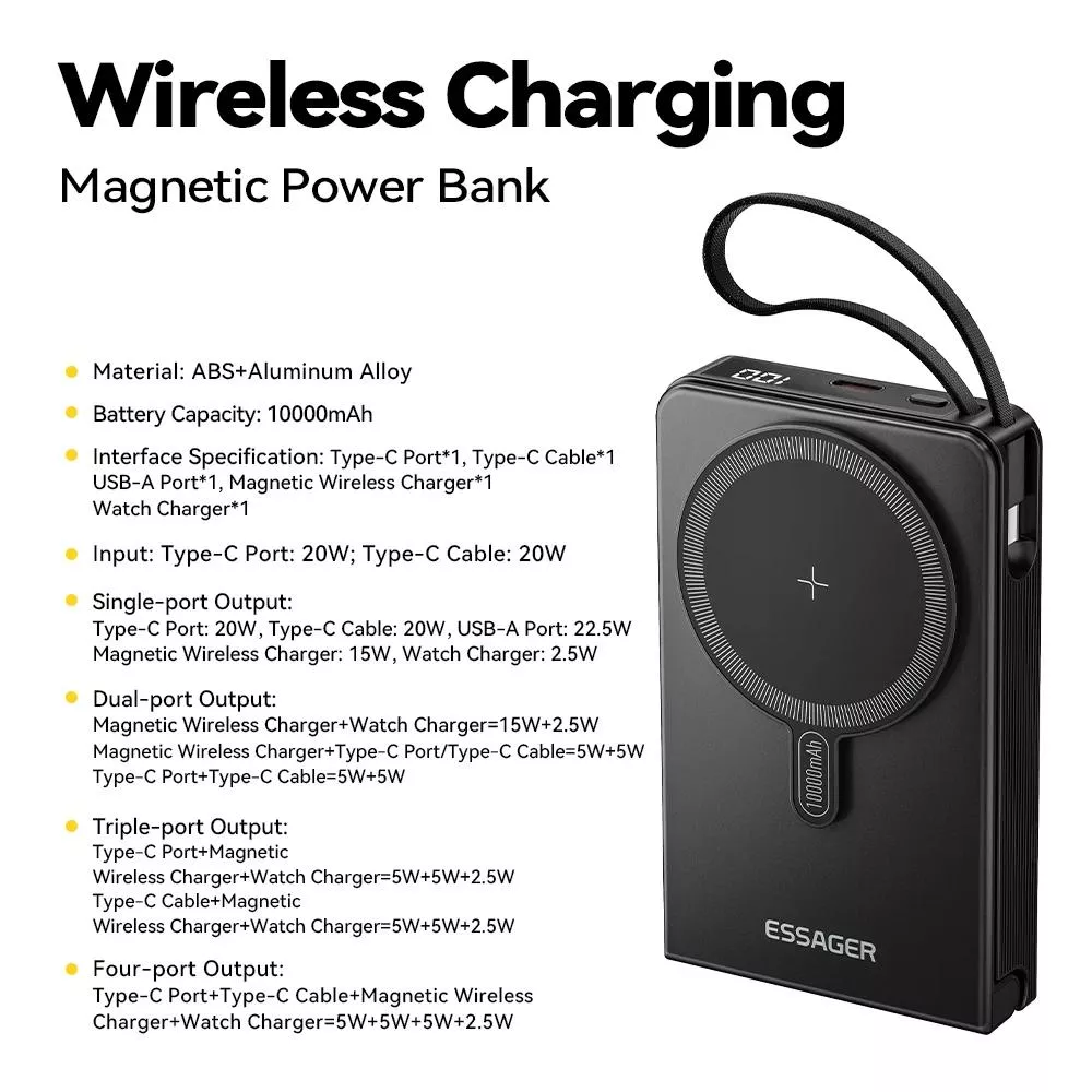 Say goodbye to low battery anxiety with this sleek and powerful 5-in-1 Magnetic Wireless Power Bank. Built for convenience and speed, this all-in-one charger is your perfect everyday companion—whether you’re working, commuting, or traveling. With a massive 10000mAh capacity, you can effortlessly charge your iPhone, wireless earbuds, smartwatch, and even your USB-C or USB-A devices simultaneously.
