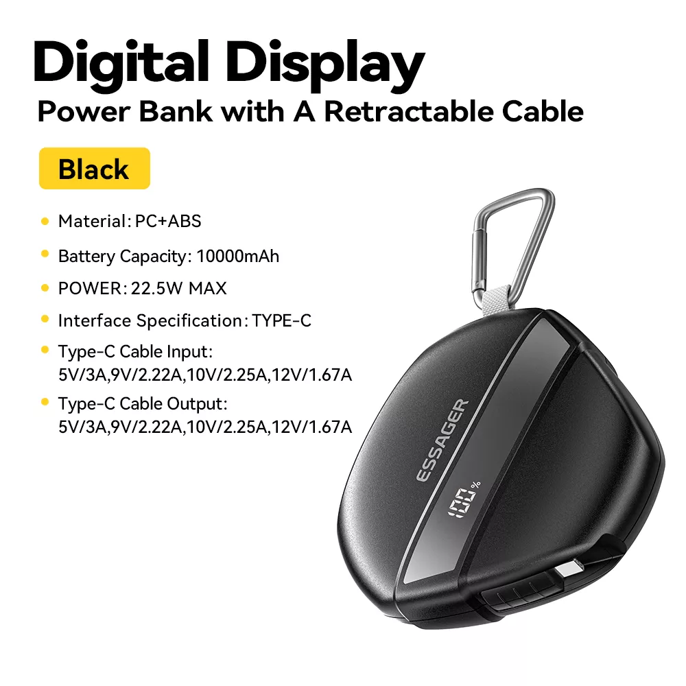 Equipped with a high-capacity 10000mAh Li-polymer battery, it supports ultra-fast 22.5W two-way quick charging — keeping your phone, tablet, or headphones juiced up in record time. Built-in retractable cables, including USB-Type C and Lightning, eliminate messy wires and make charging a breeze. The clear digital display keeps you informed of your remaining battery life, so you’re never caught off guard.