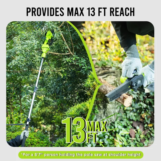 • Extended Reach – Pole extends up to 13 feet to trim hard-to-reach branches