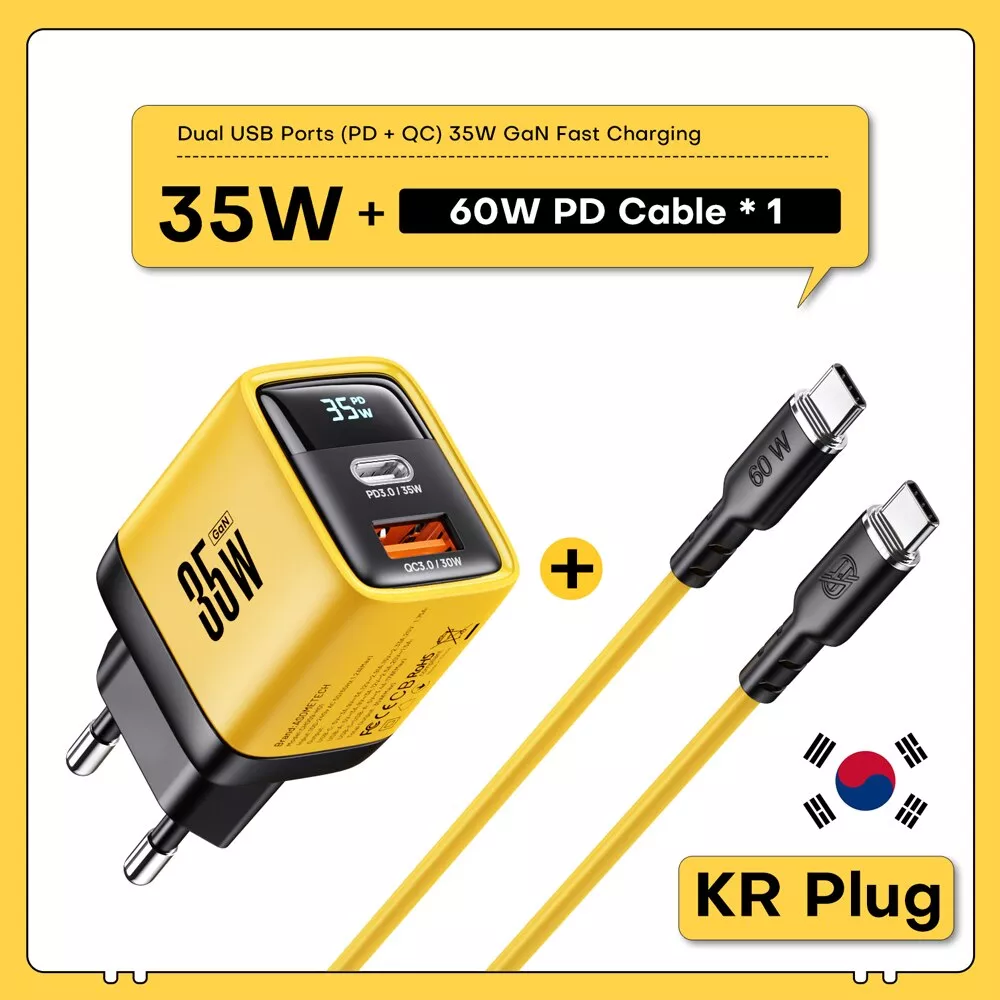 This charger features two ports—one USB-C and one USB-A—allowing you to charge two devices simultaneously. With a maximum output of 35W, the USB-C port delivers rapid PD charging, while the USB-A port offers QC3.0 fast charging up to 30W. Together, they provide a combined output that efficiently powers up your smartphone, tablet, or laptop in no time.