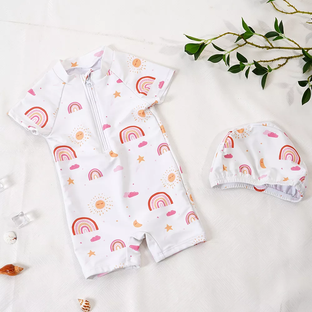 Get your little one summer-ready with our charming baby swimsuit set designed for infants and toddlers aged 0 to 2 years. Whether you’re planning a beach day, a poolside afternoon, or a splash in the backyard, this short-sleeve baby swimwear with matching hat is the perfect pick. With a playful print, breathable design, and thoughtful details, this swimsuit blends functionality with cuteness, making it a must-have for sunny adventures.