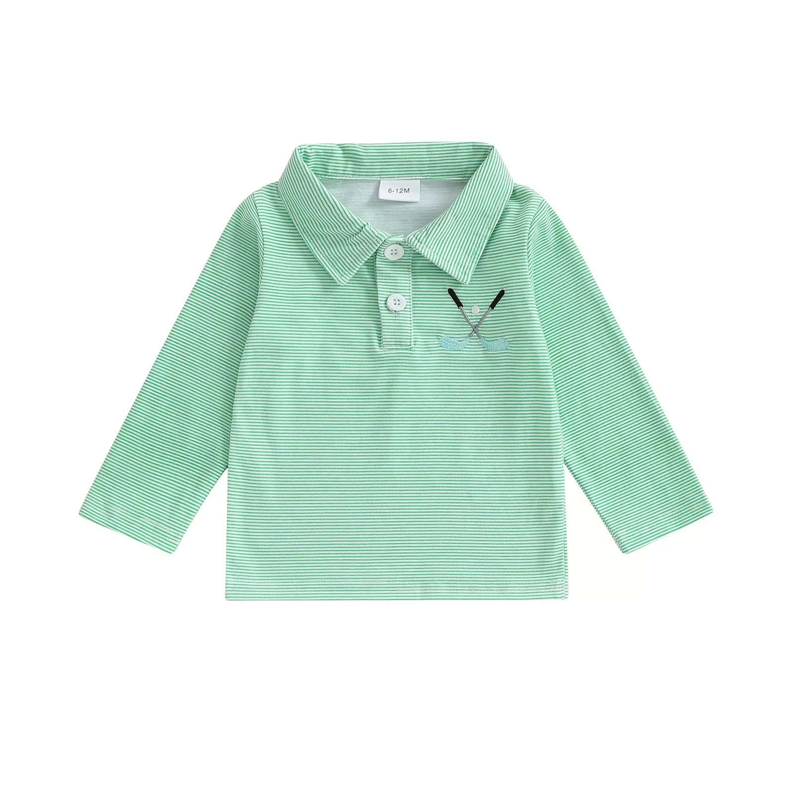 What sets this shirt apart is its charming golf-themed embroidery that brings a unique and playful vibe to classic stripes. Crafted with care and made from a skin-friendly fabric, it blends style and comfort seamlessly. It’s not just a shirt—it’s a personality piece for your little trendsetter.