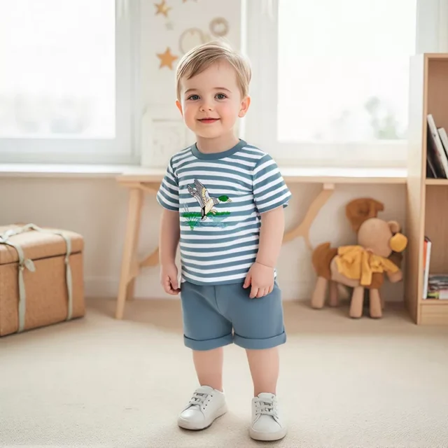 Dress your little one in charm and comfort with this delightful 2-piece summer outfit for baby boys. Featuring a cute striped short sleeve t-shirt with a playful duck embroidery and a pair of soft, solid-colored shorts, this set is perfect for warm-weather adventures. Whether it’s a family outing, a playdate in the park, or just a casual day at home, this outfit keeps your baby stylish and comfy all day long.