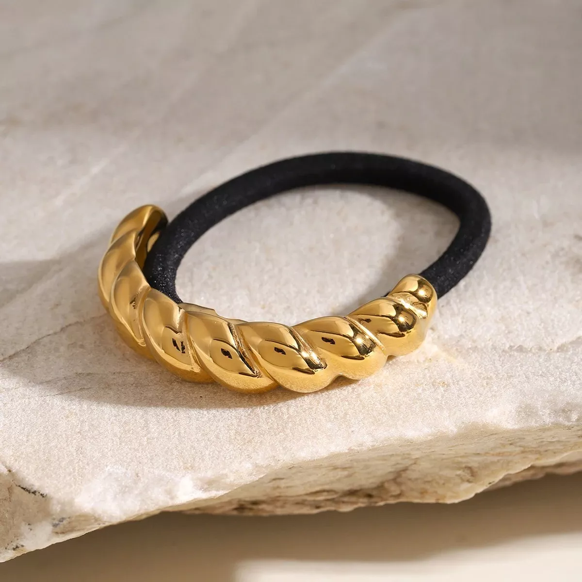Discover the perfect accessory to elevate your hairstyle with this elegant 18K gold plated U-shaped hair clip. Crafted from high-quality stainless steel and finished with a luxurious gold plating, this hair clip combines classic vintage charm with modern durability. Its unique whorl design and black rubber hairband provide both style and a secure hold, making it ideal for ponytails, buns, or simply adding a polished touch to any look.