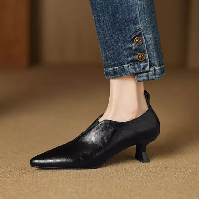These kitten heel pumps are the perfect blend of comfort and sophistication. Whether you’re running errands, heading to the office, or going out for a casual evening, these shoes will complement any look. Their slip-on design ensures ease of wear, while the soft sheepskin lining keeps your feet feeling cozy all day long. The 5cm heel provides a subtle lift without sacrificing comfort, making these pumps ideal for women on the go. Plus, their solid color and pointed toe offer a sleek and refined aesthetic that will never go out of style.