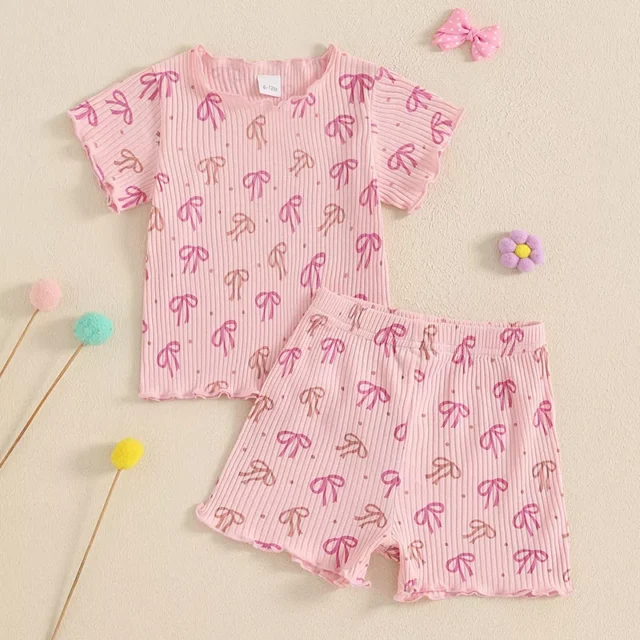 Looking for the perfect outfit to keep your little one cute and comfy all summer long? This charming 2-piece shorts set for girls is made to impress. Featuring a ribbed short sleeve T-shirt with a sweet bow print and lettuce trim, paired with matching elastic-waist shorts, this outfit is a go-to for warm weather fun. Whether she’s playing in the park, attending a birthday party, or just hanging out at home, your little girl will love how soft, breathable, and stylish this outfit feels.