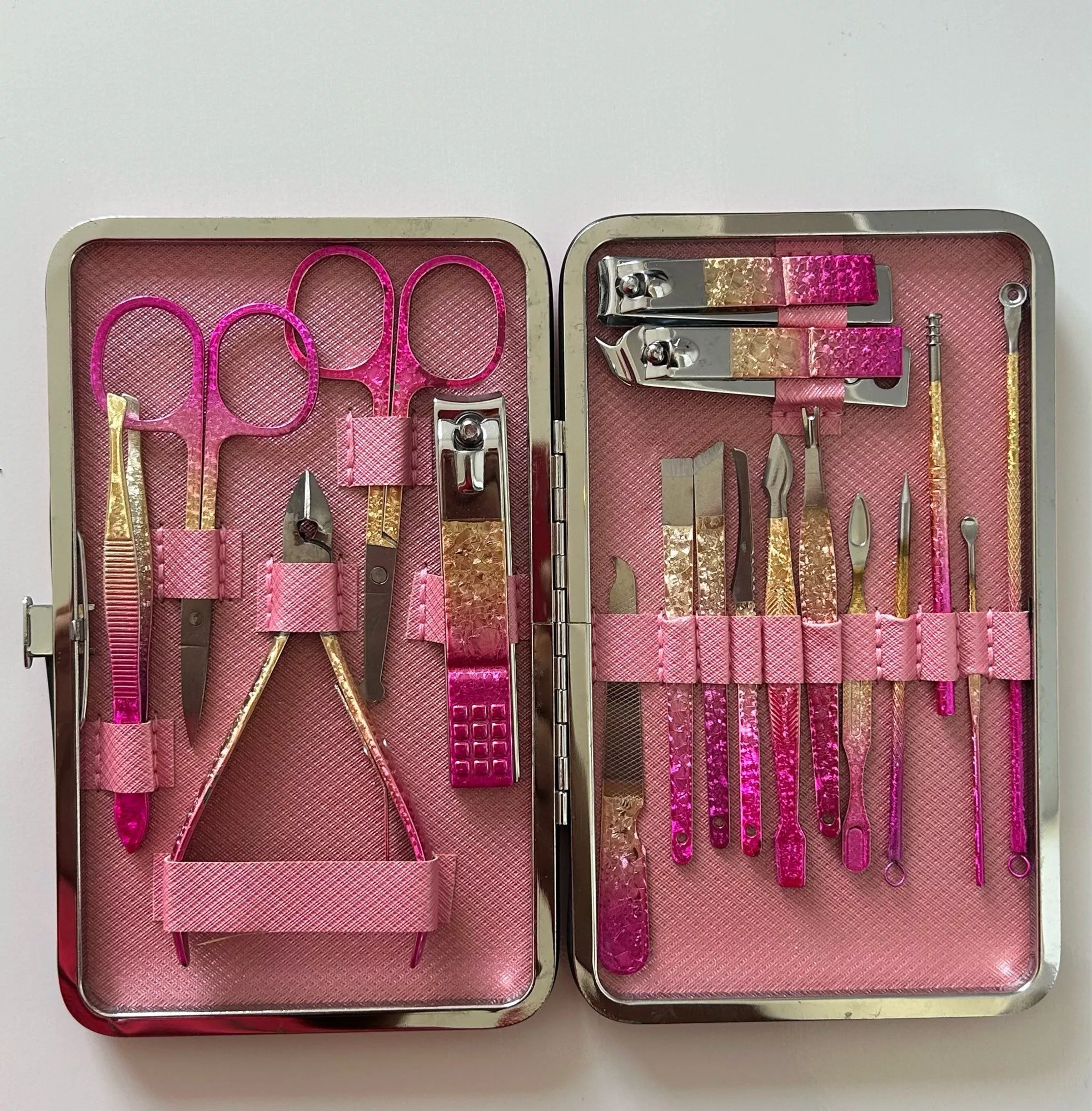 Indulge in a premium nail care experience with the Luxury Gradient Pink Gold Manicure & Pedicure Set. Designed for the modern individual who values both style and functionality, this set combines the essentials of professional-grade nail care with a stunning aesthetic. The delicate gradient of pink and gold adds a touch of sophistication, making this set not just a tool but a statement piece for your grooming routine.