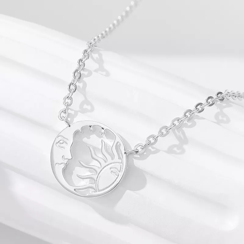 This beautiful necklace features a crescent moon and sun pendant, symbolizing balance, harmony, and the duality of life. The coin-shaped pendant is intricately designed, showcasing the delicate details of the celestial bodies, making it a standout piece in any jewelry collection.