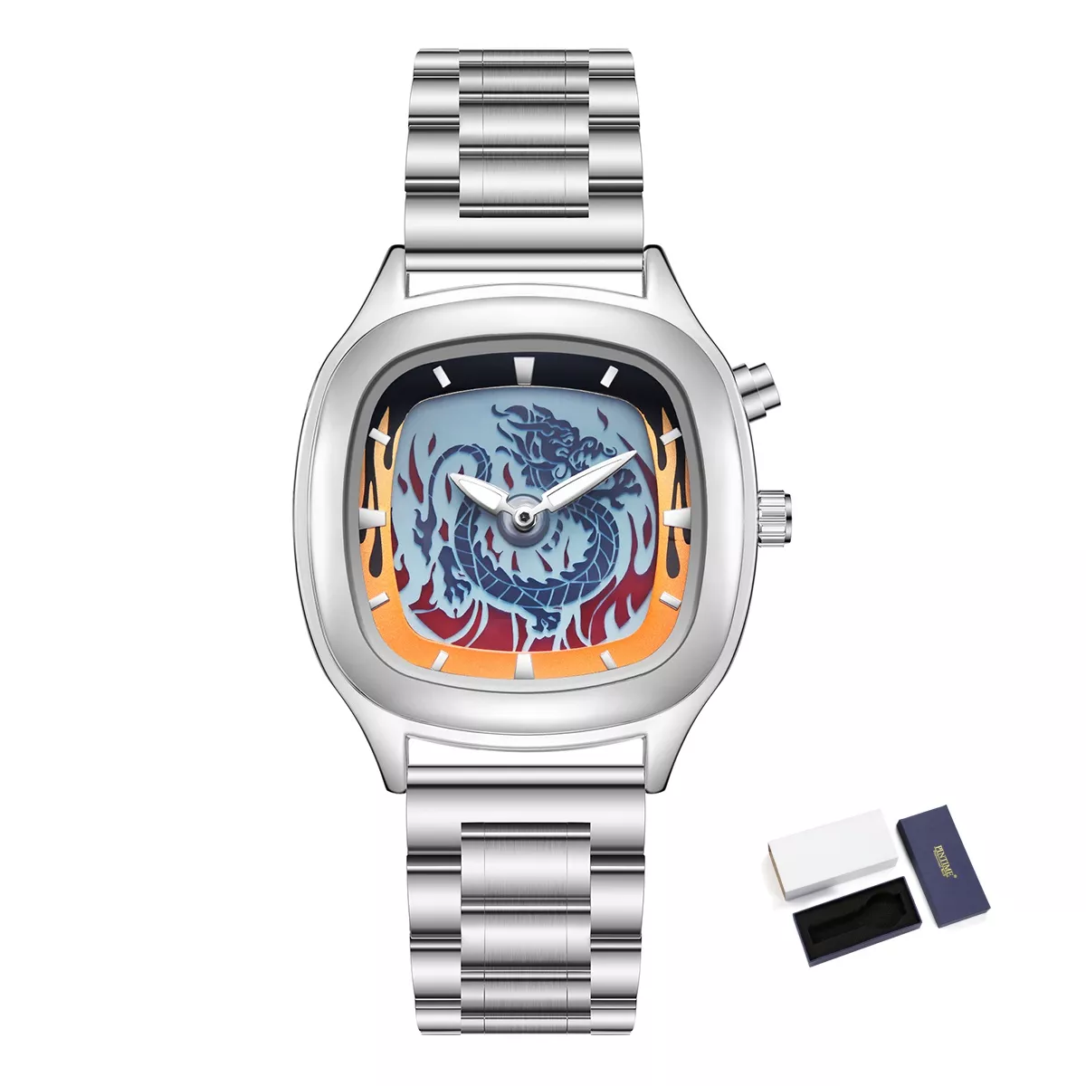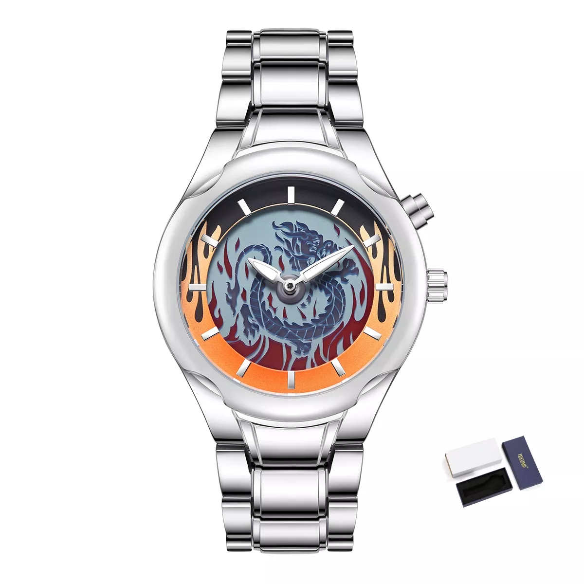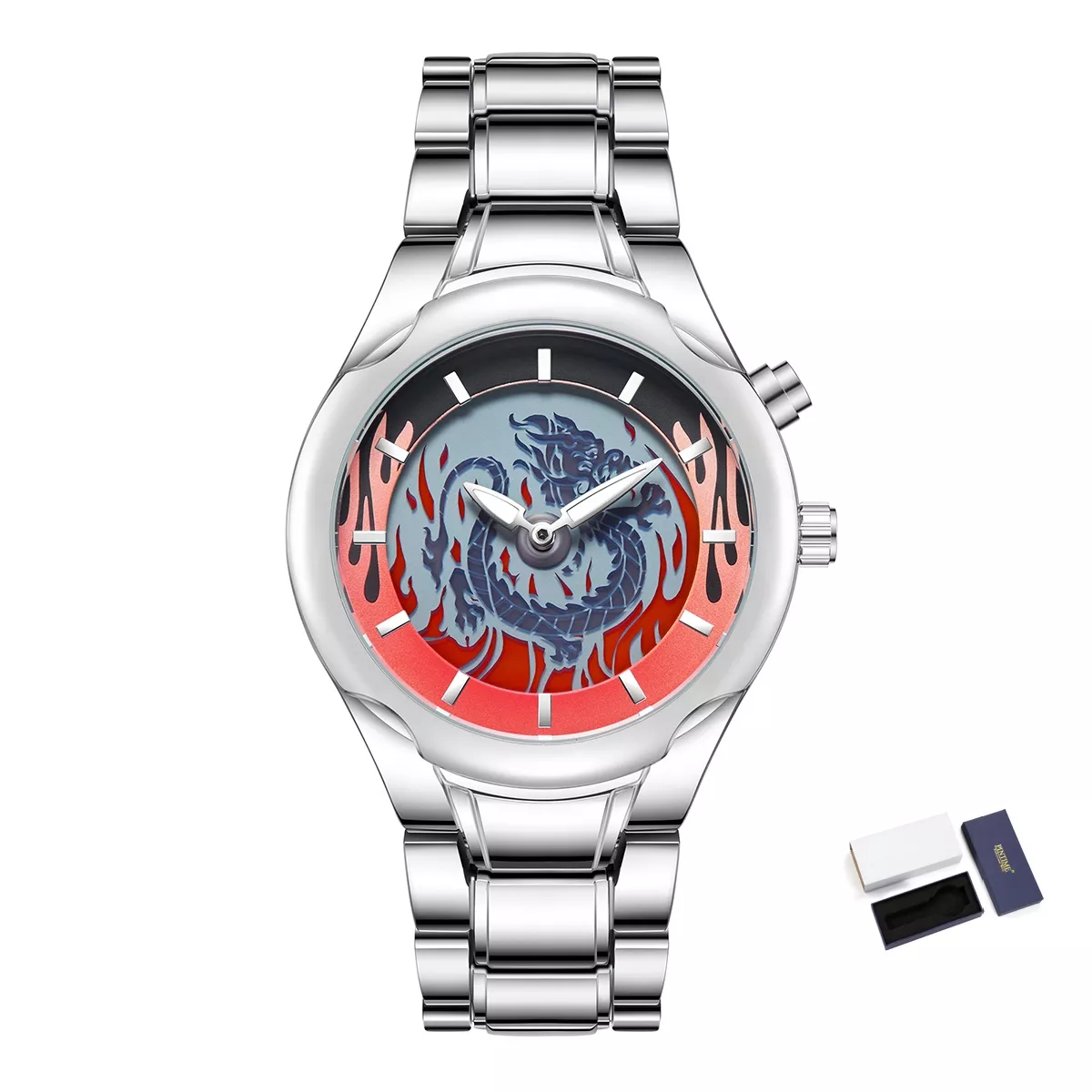 This watch is not just about telling time; it’s an expression of personality and style. The vibrant flame and dragon dial make it stand out in any crowd, perfect for fashion-forward individuals who appreciate artistic details. Its waterproof feature allows worry-free wear during daily activities, and the stainless steel construction means it can handle your active lifestyle. Whether you’re gifting it or adding to your own collection, this watch brings together originality and practicality in one sleek package.