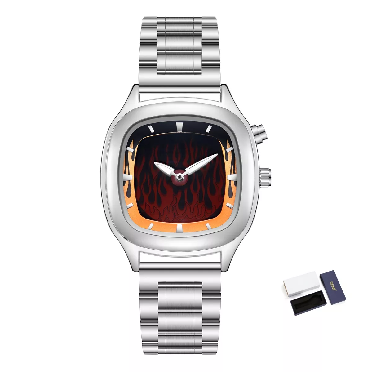 Make a bold statement with this personalized watch featuring a mesmerizing multi-color flame background and an intricate dragon pattern on the dial. Designed for those who dare to stand out, this timepiece combines eye-catching artistry with reliable functionality. Its square stainless steel case and strap offer a modern yet rugged appeal that suits both casual outings and everyday wear. Whether you’re heading to work, a night out, or simply want to express your unique style, this watch is crafted to elevate your look effortlessly.