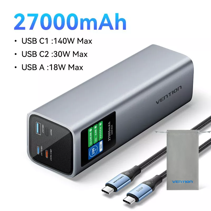 Stay charged anywhere, anytime with this ultra-powerful 27000mAh portable power bank. Designed for people on the go, this fast-charging external battery delivers up to 140W of output, making it strong enough to recharge even power-hungry devices like laptops and MacBooks. With dual USB-C and USB-A ports, it’s the perfect power solution for work, travel, and emergencies.